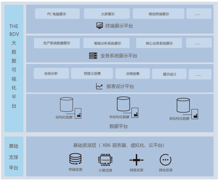 THE BDV大数据可视化软件拥有强大的企业级数据计算及管理能力,无需编程的简易安装配合灵活的集成方案即可提供海量数据(结构化/非结构化数据)管理能力和计算能力。